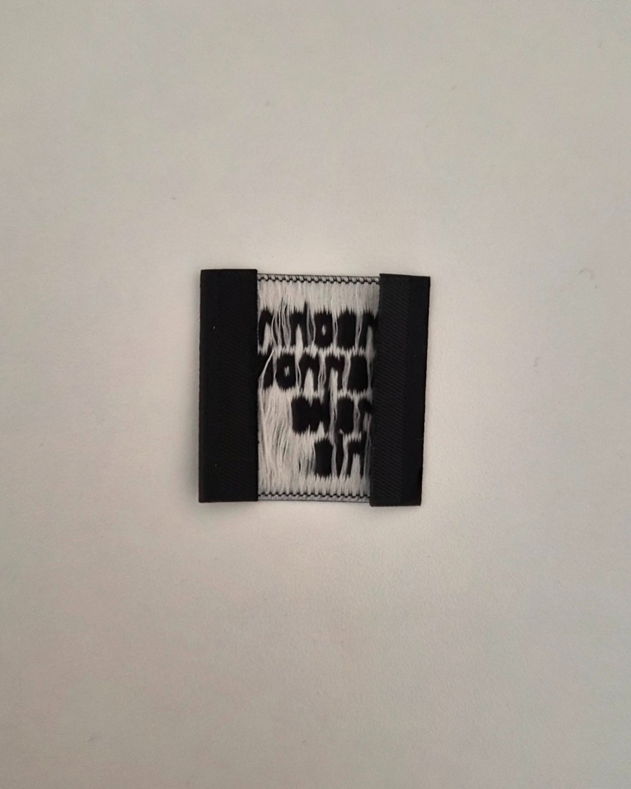 編み終わった作品を彩るファブリック刺繍ラベル。