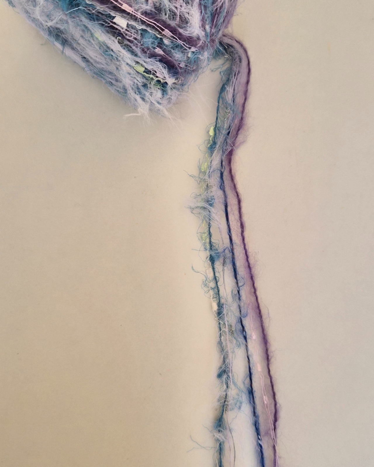 ブルー・パープル系の起毛糸に、別素材のファンシーヤーンを加えて、光がきらめくような繊細な表情をプラスしています。