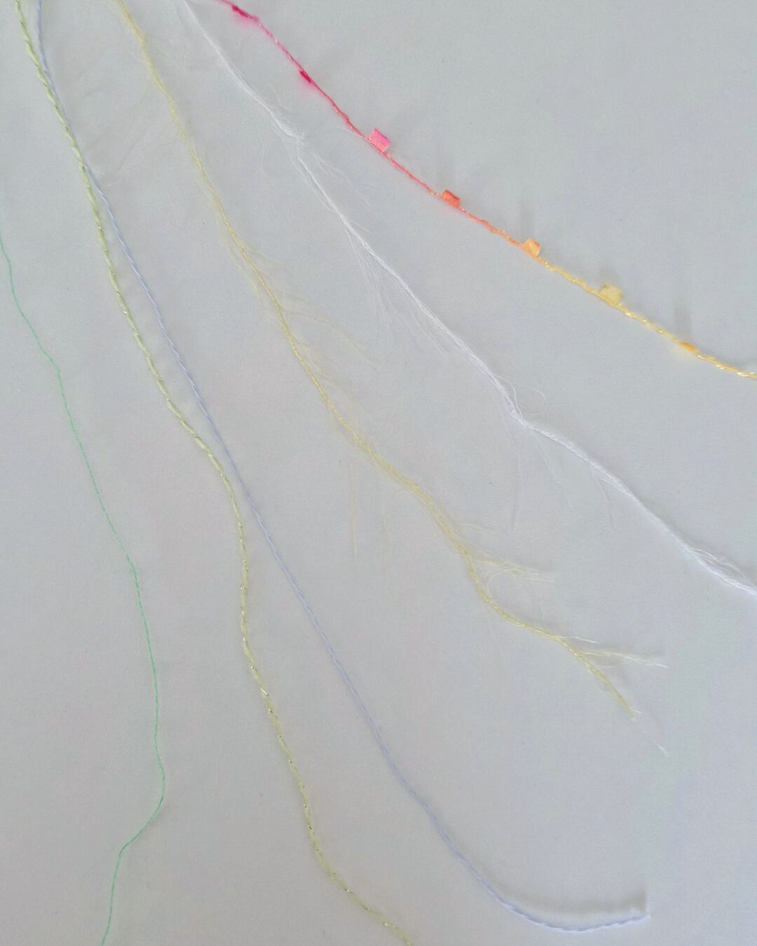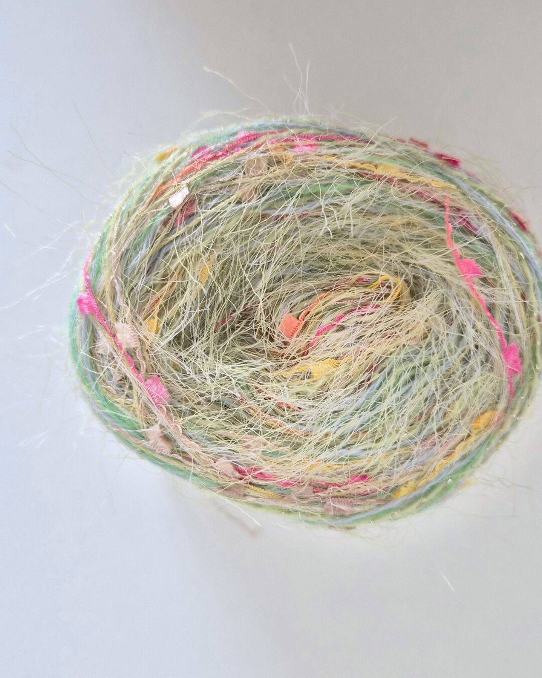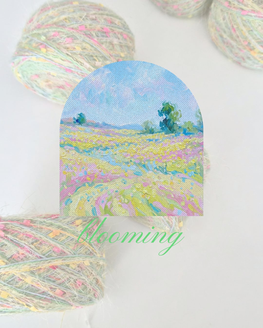 やわらかなグリーンをベースに、ピンクやイエローのカラフルな糸が重なり合い、花が咲きはじめる瞬間のような軽やかな色合いに仕上げました。